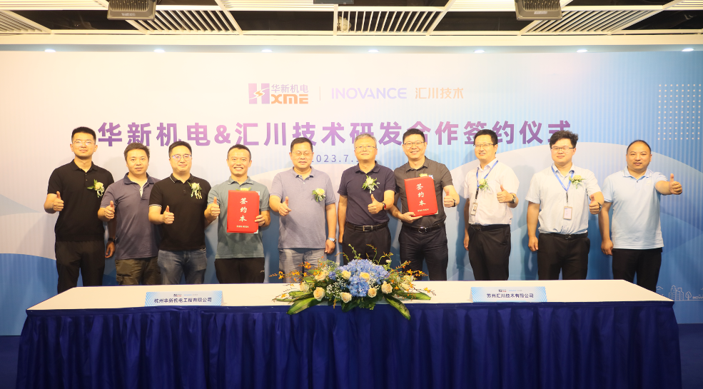 2023年7月12日,江蘇蘇州,杭州華新機電工程有限公司和蘇州匯川技術有限公司舉行了研發合作協議簽署儀式,華新機電副總經理沈策和匯川技術重工裝備SBU總裁王小杰作為雙方代表,在華新機電總經理王吉如和匯川技術聯合創始人、匯川書院院長張衛江的見證下,簽署了雙方在“電力系統裝備國產化關鍵技術研發”的戰略合作協議。