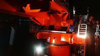 池州項目螺旋卸船機是國內首臺安裝于躉船上的創新設備,此項目單臺卸船機裝卸效率可達800噸/小時。其設計需克服躉船橫搖縱搖對設備運行穩定性的影響,且因躉船空間限制,傳統機械檢修裝置無法上船。由于沒有任何先例經驗進行參考,一切都要靠自己摸索,黨員突擊隊成立技術攻堅小組,牽頭開展模擬實驗,創新性在螺旋卸船機各關鍵部位加裝定制化檢修平臺和裝置,既解決了設備維護難題,又能有效降低后期維修改造成本。