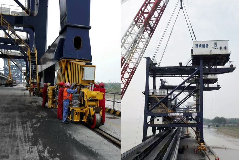 本次兩臺卸船機(7#機、8#機)于2016年9月中旬在張家港制造基地整機安裝結束后,于9月17日開始滾裝,并分別于9月19日,9月20日滾裝上船,加固海固件;9月21日具備發運條件并出港; 9月22日晚搭載卸船機的駁船“匯宗海”安全抵達西壩碼頭;9月24日和25日,卸船機正式吊裝上岸并順利入軌;吊裝小門架和安裝前大梁,標志著本次滾裝、運輸、吊裝工程全部順利完成。7#機、8#機是華新機電與南京西壩共同自主研發的第二套在線料斗稱重卸船機,歷時半年時間制造完成,技術國際領先,制造工藝先進,生產工期高效。