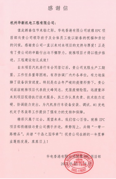 客戶的感謝信、表揚(yáng)信既是認(rèn)可亦是鞭策,榮譽(yù)屬于過去,能不能保留住這份榮譽(yù)關(guān)鍵在于現(xiàn)在的努力和未來的成果。初心如磐,使命在肩,在“為用戶創(chuàng)造價值”的這條路上,華新機(jī)電一直秉持著信念前行。